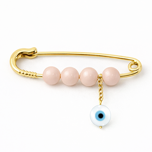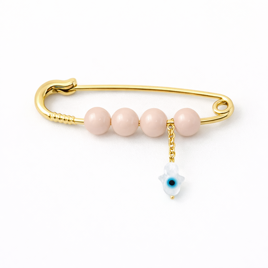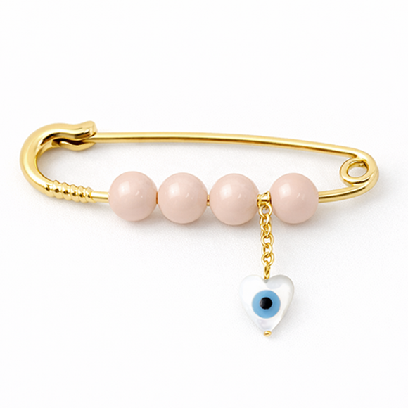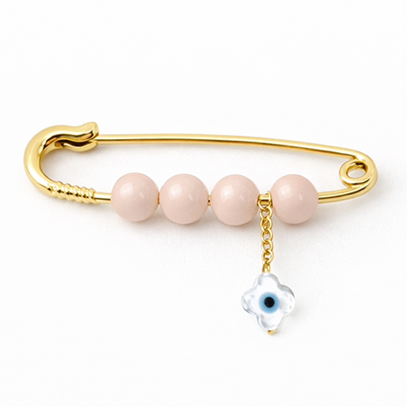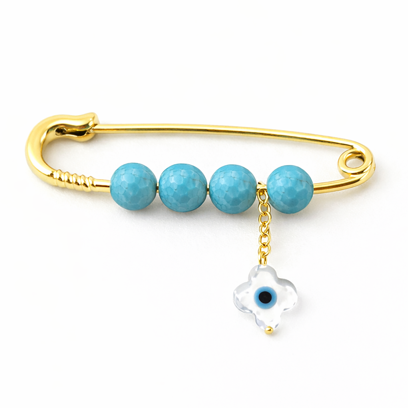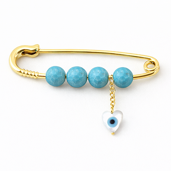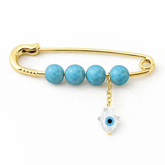 ☆ pin: 18-carat fine gold ☆ pin size: 3cm ☆ charm bead: Mother-Of-Pearl evileye, hamsa, flower, or heart ☆ charm size: 0.6mm-1cm approx ☆ pin stone bead: 4 qty - Turquoise Blue ☆ pop those pretty stone beadz onto your pin and pin it with lots of love.