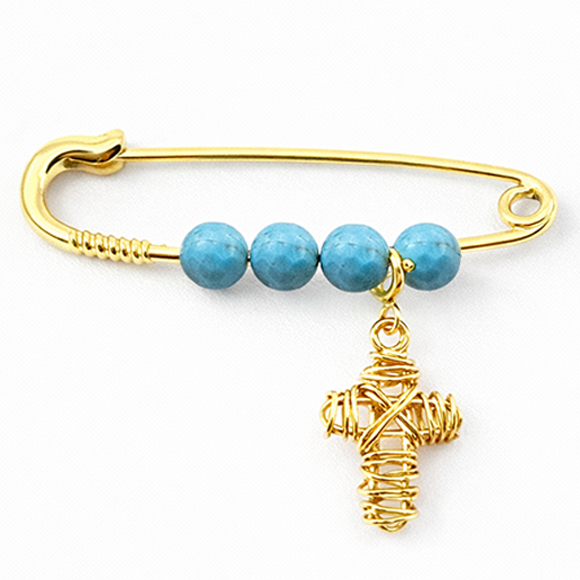 ☆ pin: 18-carat fine gold ☆ pin size: 3.5cm ☆ charm size: 1.6cm approx ☆ charm detail: 100% handmade, final pieces are not all identical in form ☆ pin stone bead: 4 qty - Turquoise Blue, Rose Quartz, or Moonwhite ☆ pin it with love!