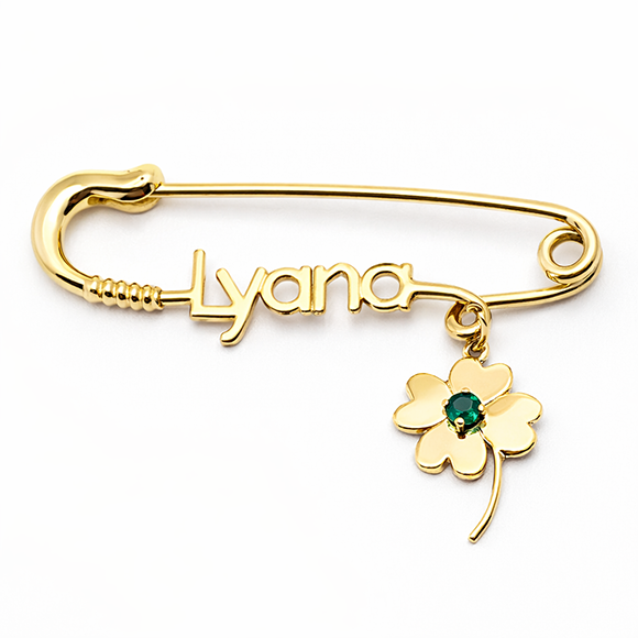 ☆ pin: 18-carat fine gold ☆ pin size: 3.5, 4.5, 5cm ☆ charm size: 1.5cm approx ☆ name: letter limit set by pin size ☆ charm precious gem: Emerald ☆ name it then pin it close to your heart for blessing!