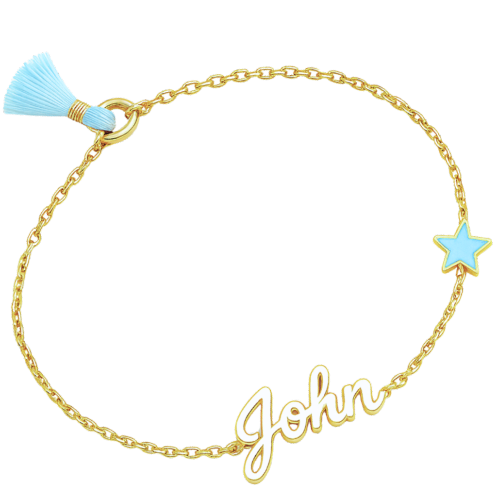 ☆ bracelet: 18-carat fine yellow gold ☆ chain: adjustable sizes ☆ name size: 1.6cm approx ☆ charm size: 0.6cm approx ☆ Enamel: color fill options for name and star.