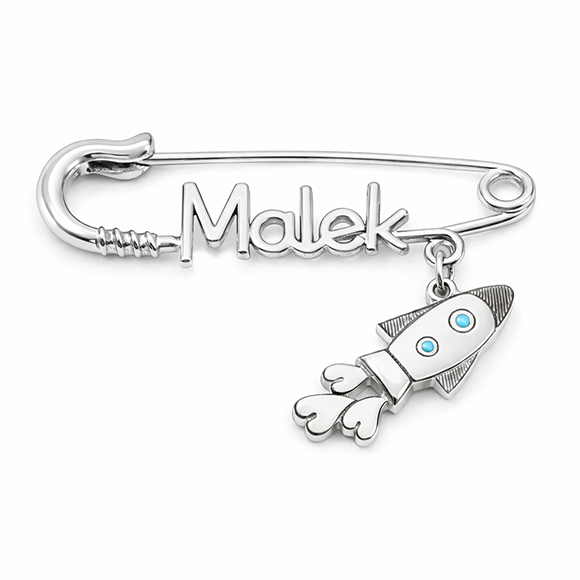 ☆ pin: 18-carat fine gold ☆ pin size: 3.5cm, 4.5cm, 5cm ☆ charm size: 1.6cm approx ☆ name: letter limit set by pin size ☆ charm precious stone: Turquoise Blue ☆ clip it on and let the sweet magic of the love rocket ship light up your adventures!