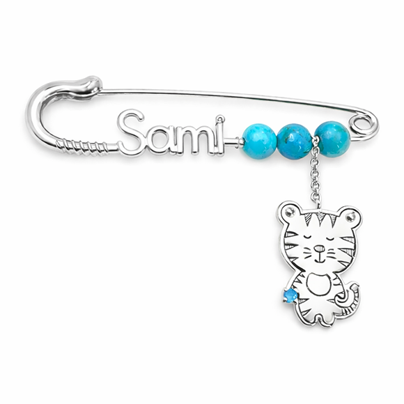 ☆ pin: 18-carat fine gold ☆ pin size: 4cm, 4.5cm, 5cm ☆ charm size: 1.5cm approx ☆ name: letter limit set by pin size ☆ charm precious stone: Turquoise Blue ☆ pin stone beadz: 3 qty - Turquoise Blue, Rose Quartz, or Moonwhite ☆ Metal: yellow, white, or rose gold ☆ name it, clip it and let the wild cat's magic inspire you!