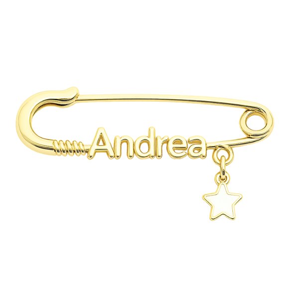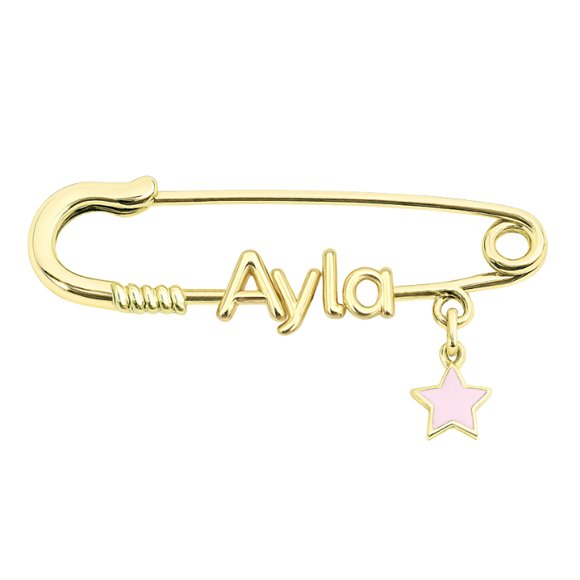 ☆ pin: 18-carat fine gold ☆ personalized pin size: 3.5cm, 4.5cm, 5cm ☆ charm size: 0.8cm approx ☆ charm options: heart & star - blue enamel, pink enamel, or white enamel ☆ name: letter limit set to pin size ☆ clip it on and watch as your baby's brilliance lights up every moment!